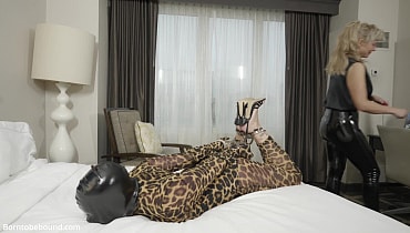 A spy named Carissa Dumond walks down the hall and knocks on a hotel room door excited to see someone special to her, JJ Plush. Carissa hands over a pen drive that JJ desperately needs. She is kissed and quickly cuffed with hinged cuffs on her wrists and ankles. A hood goes over her beautiful face leaving only her mouth exposed. She is helped onto the bed and then hogcuffed. She struggles on the bed having no idea what is going to happen since she can’t see anything at all. She is a bit frightened. After being let out of the hogcuff she has to move very slowly over to a chair while still cuffed and unable to see. Once seated many leg ropes go on, with crossed ankles rendering her even more helpless. Her arms are tied up tightly, she is helped to the floor and a red ballgag goes between her teeth. She gets tied into a little ball and then things take a turn when JJ leaves her there not knowing what will happen next.
