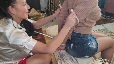 Pretty lady in white bound and vibed by a lady thief