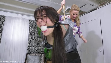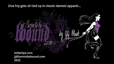 Leggy Ziva Fey paces the room with her wrists bound in classic damsel apparel. I come in and tell her that we are going to try various bondage positions and gags together. It was our first time working together and from what I understood at the time she didn’t do a lot of bondage clips like I do. So Ziva gets her elbows bound and is put into a strappado while ballgagged. She drools all over. She gets a crotch rope and I tie up her legs. Her arms have had it so a boxtie goes on to continue our little adventure. She sits in a chair and struggles with a scarf in her mouth and vetwrap around her head. Then it is time to hogtie her on the floor. She is ready to get that gag off after being hogtied for a short time. We aren’t done yet. I tie the hogtie rope off to the ceiling and then I use the stretchy belt to pull her head back a bit into the hogtie.